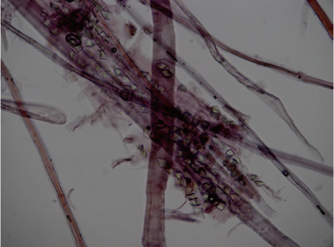 構(gòu)皮紙還有一個(gè)非常重要的特征是除纖維細(xì)胞外,紙張纖維中還能見(jiàn)到大量的草酸鈣晶體(如圖4),多呈菱形或者正方形,常存在于薄型細(xì)胞的腔內(nèi)或者細(xì)胞與細(xì)胞之間,造紙過(guò)程中的打漿和漂洗程序會(huì)使草酸鈣晶體流失,因而一些制作精細(xì)的構(gòu)皮紙中殘留的草酸鈣晶體相對(duì)少見(jiàn)。